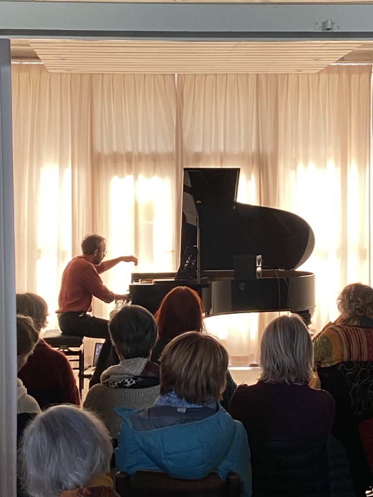 Fabian Coomans de Brachène, pianiste et compositeur, interprète des pièces de Morton Feldman, Luciano Berio et Fabian Coomans à l’occasion du finissage de l’exposition de Dominique Decamps